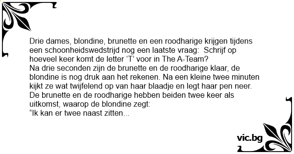 Drie dames, blondine, brunette en een roodharige krijgen tijdens een schoonheidswedstrijd nog een laatste vraag: Schrijf op hoeveel keer komt de letter ‘T’ voor in The A-Team?