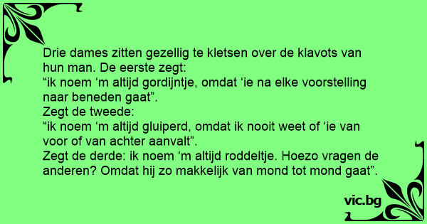 Drie dames zitten gezellig te kletsen over de klavots van hun man. De eerste zegt: “ik noem ‘m altijd gordijntje, omdat ‘ie na elke voorstelling naar beneden gaat”. Zegt de tweede: “ik noem ‘m altijd gluiperd, omdat ik nooit weet of ‘ie van voor of van achter aanvalt”. Zegt de derde: ik noem ‘m altijd roddeltje. Hoezo vragen de anderen? Omdat hij zo makkelijk van mond tot mond gaat”.