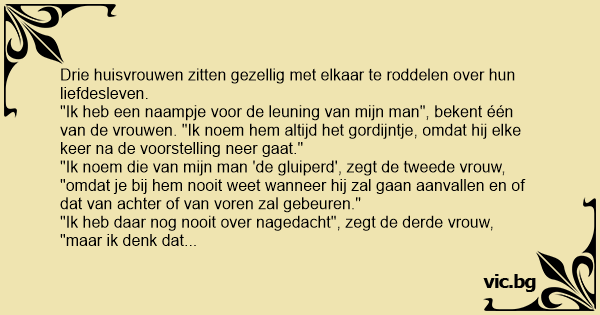 "Ik noem die van mijn man 'de gluiperd', zegt de tweede vrouw, "omdat je bij hem nooit weet wanneer hij zal gaan aanvallen en of dat van achter of van voren zal gebeuren."