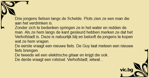 "Ja ik weet het" antwoordt de jongen, "maar als pa straks te weten komt dat ik jou uit het water heb gered, heb ik die rolstoel daarna wel nodig."