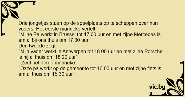 C'est trois petits enfants qui discutent à la récré. - Moi mon papa a une Mercedes et quand il finit le travail à 16h, et bien à 16h30 il est rentré. - Et bah moi mon papa il a une Ferrari et quand...