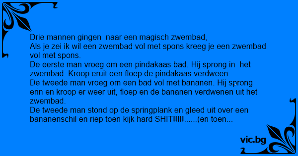 De tweede man stond op de springplank en gleed uit over een bananenschil en riep toen kijk hard SНIТ!!!!!......(en toen viel hij in de shiт!!...)