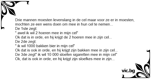 Drie mannen moesten levenslang in de cel maar voor ze er in moesten, mochten ze een wens doen om mee in hun cel te nemen...