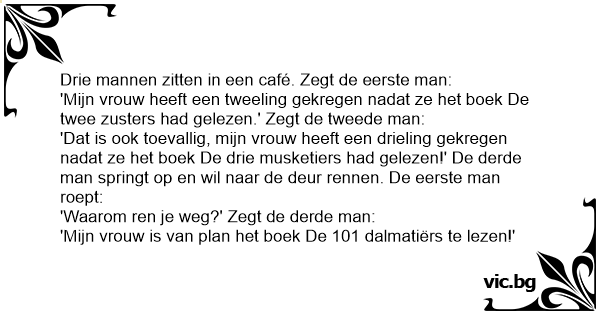 'Dat is ook toevallig, mijn vrouw heeft een drieling gekregen nadat ze het boek De drie musketiers had gelezen!' De derde man springt op en wil naar de deur rennen. De eerste man roept: