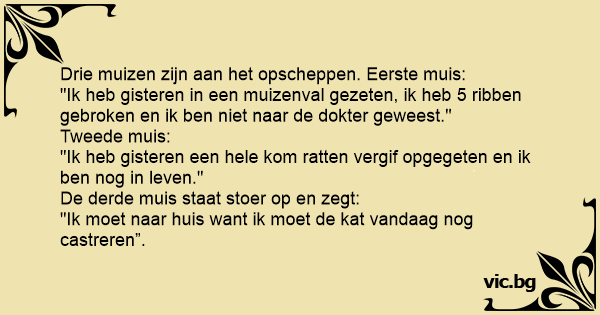 Drie muizen zijn aan het opscheppen. Eerste muis: