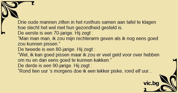 Drie oude mannen zitten in het rusthuis samen aan tafel te klagen hое slecht het wel met hun gezondheid gesteld is.