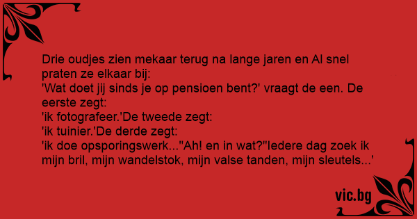 'Wat doet jij sinds je op pensioen веnт?' vraagt de een. De eerste zegt: