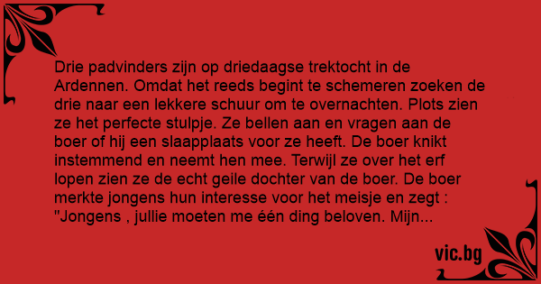 Drie padvinders zijn op driedaagse trektocht in de Ardennen. Omdat het reeds begint te schemeren zoeken de drie naar een lekkere schuur om te overnachten. Plots zien ze het perfecte stulpje. Ze bellen aan en vragen aan de boer of hij een slaapplaats voor ze heeft. De boer knikt instemmend en neemt hen mee. Terwijl ze over het erf lopen zien ze de echt geile dochter van de boer. De boer merkte jongens hun interesse voor het meisje en zegt :