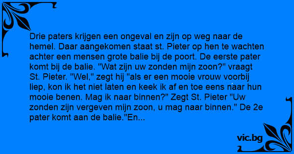 Drie paters krijgen een ongeval en zijn op weg naar de hemel. Daar aangekomen staat st. Pieter op hen te wachten achter een mensen grote balie bij de poort. De eerste pater komt bij de balie. "Wat zijn uw zonden mijn zoon?" vraagt St. Pieter. "Wel," zegt hij "als er een mooie vrouw voorbij liep, kon ik het niet laten en keek ik af en toe eens naar hun mooie benen. Mag ik naar binnen?" Zegt St. Pieter "Uw zonden zijn vergeven mijn zoon, u mag naar binnen." De 2e pater komt aan de balie."En mijn zoon, wat zijn uw zonden?"