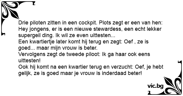 Twee piloten zitten in de cockpit en hebben het over de nieuwe stewardess. "Ze neukt wel aardig, maar m'n vrouw is toch een stuk beter." zegt de een. De ander wordt nieuwsgierig en loopt even naar...