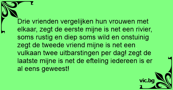Drie vrienden vergelijken hun vrouwen met elkaar, zegt de eerste mijne is net een rivier, soms rustig en diep soms wild en onstuinig zegt de tweede vriend mijne is net een vulkaan twee uitbarstingen per dag! zegt de laatste mijne is net de efteling iedereen is er al eens geweest!