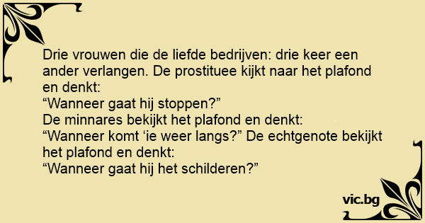 Šta misle devojka, prostitutka i udata žena dok vode ljubav? Devojka misli: važno je da ne ostanem trudna. Prostitutka misli: nadam se da ovaj dobro plaća. Žena misli: ovaj plafon stvarno mora da...