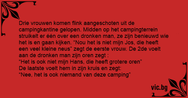 Drie vrouwen komen flink aangeschoten uit de campingkantine gelopen. Midden op het campingterrein struikelt er één over een dronken man, ze zijn benieuwd wie het is en gaan kijken. “Nou het is niet mijn Jos, die heeft een veel kleine neus” zegt de eerste vrouw. De 2de voelt aan de dronken man zijn oren zegt :