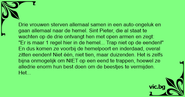 Drie vrouwen sterven allemaal samen in een auto-ongeluk en gaan allemaal naar de hemel. Sint Pieter, die al staat te wachten op de drie ontvangt hen met open armen en zegt: