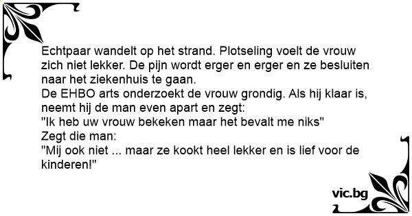 De EHBO arts onderzoekt de vrouw grondig. Als hij klaar is, neemt hij de man even apart en zegt: