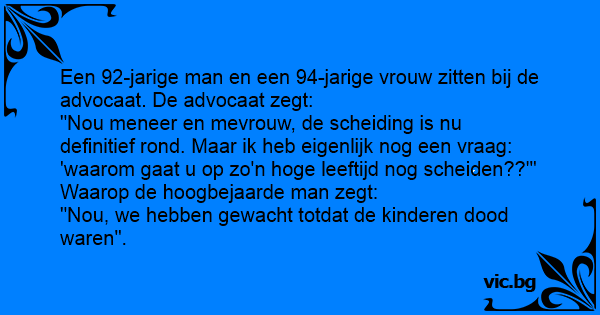 Een 92-jarige man en een 94-jarige vrouw zitten bij de advocaat. De advocaat zegt: "Nou meneer en mevrouw, de scheiding is nu definitief rond. Maar ik heb eigenlijk nog een vraag: 'waarom gaat u op zo'n hoge leeftijd nog scheiden??'" Waarop de hoogbejaarde man zegt: "Nou, we hebben gewacht totdat de kinderen dood waren".