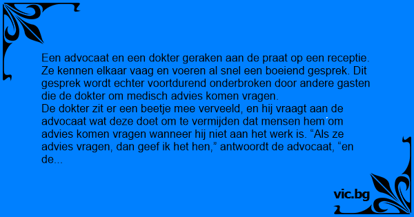 De dokter zit er een beetje mee verveeld, en hij vraagt aan de advocaat wat deze doet om te vermijden dat mensen hem om advies komen vragen wanneer hij niet aan het werk is. “Als ze advies vragen, dan geef ik het hen,” antwoordt de advocaat, “en de volgende ochtend stuur ik ze een rekening. Bij de meesten gebeurt het maar 1 keer.”