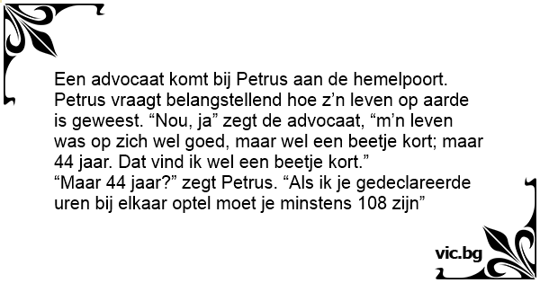 Een accountant gaat dood en komt aan de hemelpoort. "Er moet een vergissing zijn", zegt hij, "ik ben pas 55, ik hoor nog niet dood te zijn." "55?" zegt Petrus, "volgens onze berekeningen bent u 83,...