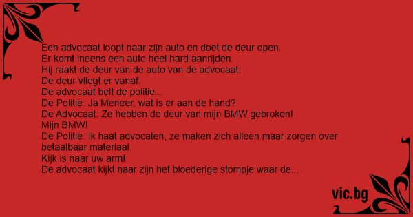 A lawyer opened the door of his BMW, when suddenly a car came along and hit the door, ripping it off completely. When the police arrived at the scene, the lawyer was hopping up and down with rage, complaining bitterly about the damage to his precious...