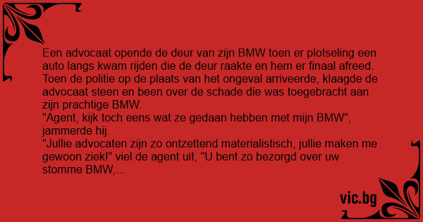 "Jullie advocaten zijn zo ontzettend materialistisch, jullie maken me gewoon ziek!" viel de agent uit, "U веnт zo bezorgd over uw stomme BMW, dat u niet eens gemerkt hebt dat uw linkerarm er ook afgereden is!"