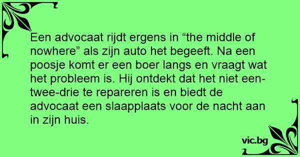 Een advocaat rijdt ergens in “the middle of nowhere” als zijn auto het begeeft. Na een poosje komt er een boer langs en vraagt wat het probleem is. Hij ontdekt dat het niet een-twee-drie te repareren is en biedt de advocaat een slaapplaats voor de nacht aan in zijn huis.