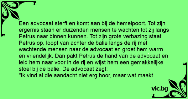 Een advocaat komt bij Petrus aan de hemelpoort. Petrus vraagt belangstellend hoe z’n leven op aarde is geweest. “Nou, ja” zegt de advocaat, “m’n leven was op zich wel goed, maar wel een beetje...