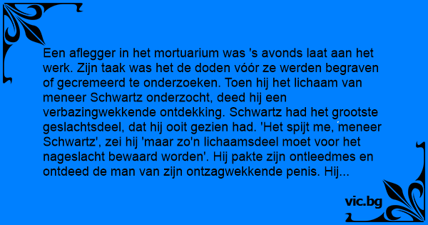 Een aflegger in het mortuarium was 's avonds laat aan het werk. Zijn taak was het de doden vóór ze werden begraven of gecremeerd te onderzoeken. Toen hij het lichaam van meneer Schwartz onderzocht, deed hij een verbazingwekkende ontdekking. Schwartz had het grootste geslachtsdeel, dat hij ooit gezien had. 'Het spijt me, meneer Schwartz', zei hij 'maar zo'n lichaamsdeel moet voor het nageslacht bewaard worden'. Hij pakte zijn ontleedmes en ontdeed de man van zijn ontzagwekkende реnis. Hij stopte het in zijn koffer en nam het mee naar huis. De eerste aan wie hij het liet zien was zijn vrouw.
