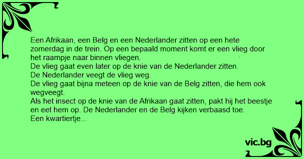 Een Afrikaan, een Belg en een Nederlander zitten op een hete zomerdag in de trein. Op een bepaald moment komt er een vlieg door het raampje naar binnen vliegen.