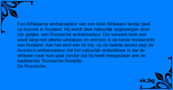 Ο πρέσβης της Ρωσίας σε κάποιο Αφρικανικό κράτος και ένας ντόπιος διπλωμάτης συζητάνε για την τεχνογνωσία που το κράτος είχε πάρει από τη Ρωσία. "Εργοστάσια, δρόμοι, αεροδρόμιο και Ρώσικη ρουλέτα"...