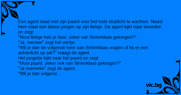 Een agent staat met zijn paard voor het rode stoplicht te wachten. Naast hem staat een kleine jongen op zijn fietsje. De agent kijkt naar beneden en zegt: