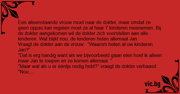 Een alleenstaande vrouw moet naar de dokter, maar omdat ze geen oppas kan regelen moet ze al haar 7 kinderen meenemen. Bij de dokter aangekomen wil de dokter zich voorstellen aan alle kinderen. Wat blijkt nou, de kinderen heten allemaal Jan.