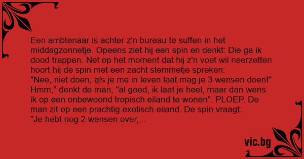 Een ambtenaar is achter z'n bureau te suffen in het middagzonnetje. Opeens ziet hij een spin en denkt: Die ga ik dood trappen. Net op het moment dat hij z'n voet wil neerzetten hoort hij de spin met een zacht stemmetje spreken: