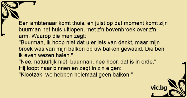 Een ambtenaar komt thuis, en juist op dat moment komt zijn buurman het huis uitlopen, met z'n bovenbroek over z'n arm. Waarop die man zegt:
