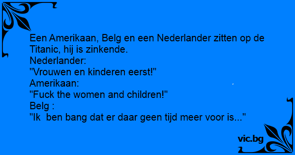 Een Amerikaan, Belg en een Nederlander zitten op de Titanic, hij is zinkende.