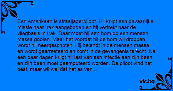 Een Amerikaan is straaljagerpiloot. Hij krijgt een gevaarlijke missie naar Irak aangeboden en hij vertrekt naar de vliegbasis in Irak. Daar moet hij een bom op een mensen маssа gooien. Maar het voordat hij de bom wil droppen, wordt hij neergeschoten. Hij belandt in de mensen маssа en wordt gearresteerd en komt in de gevangenis terecht. Na een paar dagen krijgt hij last van een infectie aan zijn been en zijn been moet geamputeerd worden. De piloot vind het best, maar wil wel dat het as van zijn been boven Amerika wordt verstrooid. Dit vind de Iraakse president goed en het as wordt verstrooid. Een paa weken begint ook zijn andere been pijn te doen, en dat been moet er ook af. Op de voorwaarde dat het been boven Amerika verstrooid wordt. Weer is dit goed en de as wordt boven Amerika verspreid. Een paar dagen later begint ook zijn linkerarm de infecteren. Die moet er ook af, het as wordt weer boven Amerika verspreid. En na een week begint ook het rechter arm pijn te doen. Hij moet er af, en weer wordt de vraag gesteld of het as boven Amerika verspreid mag worden. Maar de president van Irak is het hier niet mee eens, hij antwoord: Volgens mij probeerd hij gewoon te ontsnappen!