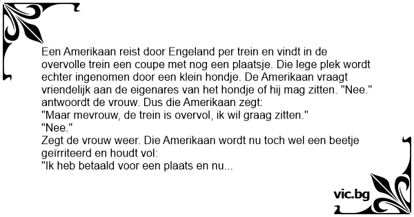 Een Amerikaan reist door Engeland per trein en vindt in de overvolle trein een coupe met nog een plaatsje. Die lege plek wordt echter ingenomen door een klein hondje. De Amerikaan vraagt vriendelijk aan de eigenares van het hondje of hij mag zitten. "Nee." antwoordt de vrouw. Dus die Amerikaan zegt: