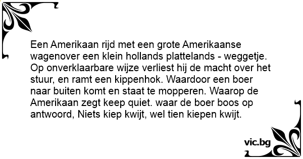 Een Amerikaan rijd met een grote Amerikaanse wagenover een klein hollands plattelands - weggetje. Op onverklaarbare wijze verliest hij de macht over het stuur, en ramt een kippenhok. Waardoor een boer naar buiten komt en staat te mopperen. Waarop de Amerikaan zegt keep quiet. waar de boer boos op antwoord, Niets kiep kwijt, wel tien kiepen kwijt.