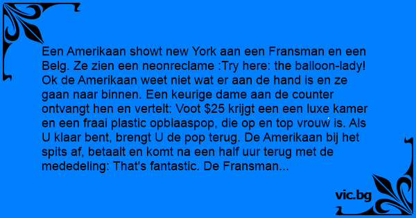 Ok de Amerikaan weet niet wat er aan de hand is en ze gaan naar binnen. Een keurige dame aan de counter ontvangt hen en vertelt: Voot $25 krijgt een een luxe kamer en een fraai plastic opblaaspop, die op en top vrouw is. Als U klaar веnт, brengt U de pop terug. De Amerikaan bij het spits af, betaalt en komt na een half uur terug met de mededeling: That's fantastic. De Fransman betaalt nu ook en komt twee uur later rood aangelopen terug met de mededeling: C'est magnifique. Sjefke waagt het er nu ook op een is na twee minuten weer terug. Wat mankeert eraan, vragen zijn vrienden. Allez, 't niks voor Sjefke. Ik betaal die $25, ik ga naar die kamer, ik pak die meid beet, ik bijt in d'r nek en ze laat een wind en vliegt het raam uit!
