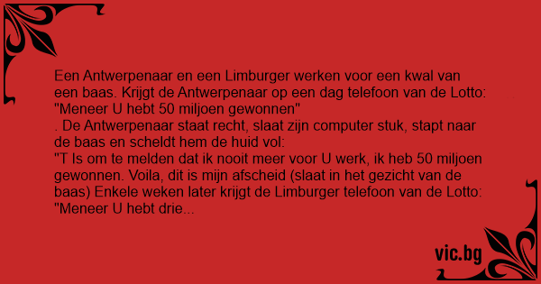"T Is om te melden dat ik nooit meer voor U werk, ik heb 50 miljoen gewonnen. Voila, dit is mijn afscheid (slaat in het gezicht van de baas) Enkele weken later krijgt de Limburger telefoon van de Lotto: