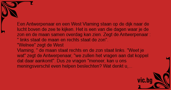 Vlaming, " de maan staat rechts en de zon staat links. "Weet je wat" zegt de Antwerpenaar, "we zullen het vragen aan dat koppel dat daar aankomt". Dus ze vragen "meneer, kan u ons meningsverschil even helpen beslechten? Wat denkt u, staat de zon links of rechts ?" Antwoord de man, die een duidelijk Limburgs accent heeft, " ik zou het niet weten heren, ik ben niet van hier".