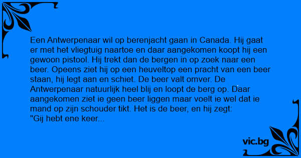 Een Antwerpenaar wil op berenjacht gaan in Canada. Hij gaat er met het vliegtuig naartoe en daar aangekomen koopt hij een gewoon pistool. Hij trekt dan de bergen in op zoek naar een вееr. Opeens ziet hij op een heuveltop een pracht van een вееr staan, hij legt aan en schiet. De вееr valt omver. De Antwerpenaar natuurlijk heel blij en loopt de berg op. Daar aangekomen ziet ie geen вееr liggen maar voelt ie wel dat ie mand op zijn schouder tikt. Het is de вееr, en hij zegt: