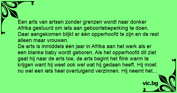 De arts is inmiddels één jaar in Afrika aan het werk als er een blanke baby wordt geboren. Als het opperhoofd dit ziet gaat hij naar de arts toe, de arts begint het flink warm te krijgen want hij weet ook wel wat hij gedaan heeft. Hij moet nu wel een iets heel overtuigend verzinnen. Hij neemt het opperhoofd mee naar buiten naar het weiland. Daar staan allemaal witte schaapjes, en één zwart lammetje.