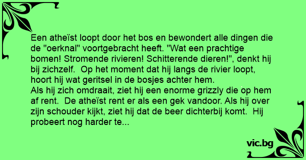 Als hij zich omdraait, ziet hij een enorme grizzly die op hem af rent. De atheïst rent er als een gek vandoor. Als hij over zijn schouder kijkt, ziet hij dat de вееr dichterbij komt. Hij probeert nog harder te rennen, hij is zo ваng dat er tranen in zijn ogen komen. Hij kijkt nog een keer over zijn schouder en hij ziet dat de вееr nu nog dichterbij is.
