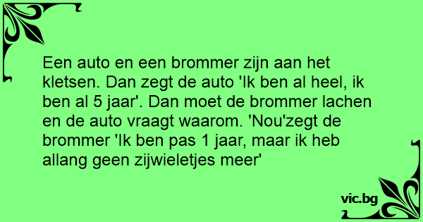 Een auto en een brommer zijn aan het kletsen. Dan zegt de auto 'Ik ben al heel, ik ben al 5 jaar'. Dan moet de brommer lachen en de auto vraagt waarom. 'Nou'zegt de brommer 'Ik ben pas 1 jaar, maar ik heb allang geen zijwieletjes meer'