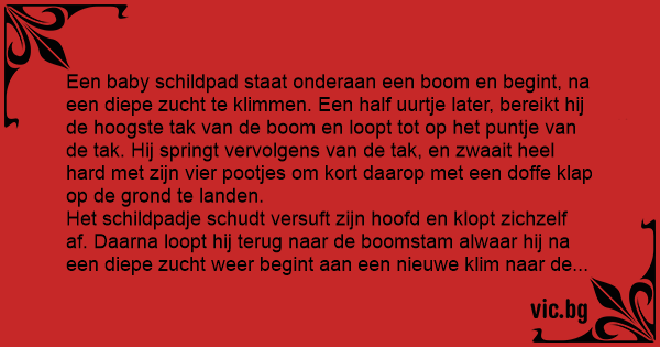 Het schildpadje schudt versuft zijn hoofd en klopt zichzelf af. Daarna loopt hij terug naar de boomstam alwaar hij na een diepe zucht weer begint aan een nieuwe klim naar de top.