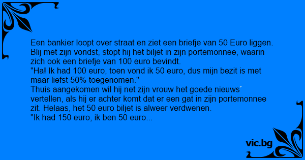 Een bankier loopt over straat en ziet een briefje van 50 Euro liggen. Blij met zijn vondst, stopt hij het biljet in zijn portemonnee, waarin zich ook een briefje van 100 euro bevindt.