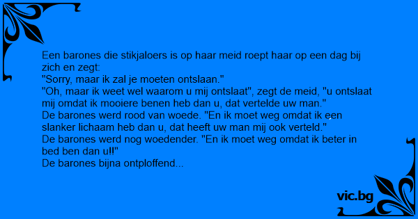 "Oh, maar ik weet wel waarom u mij ontslaat", zegt de meid, "u ontslaat mij omdat ik mooiere benen heb dan u, dat vertelde uw man."