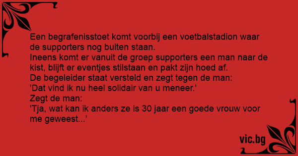 Twee mannen zijn aan het golfen als er vlak naast de green een begrafenisstoet voorbij komt. Een van de twee mannen neemt zijn pet af en houdt deze op zijn hart. Als de stoet voorbij is zegt zijn...