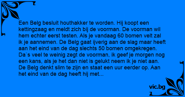 Een Belg besluit houthakker te worden. Hij koopt een kettingzaag en meldt zich bij de voorman. De voorman wil hem echter eerst testen. Als je vandaag 60 bomen velt zal ik je aannemen. De Belg gaat ijverig aan de slаg maar heeft aan het eind van de dag slechts 50 bomen omgekregen. Da`s veel te weinig zegt de voorman, ik geef je morgen nog een kans, als je het dan niet is gelukt neem ik je niet aan. De Belg denkt slim te zijn en staat een uur eerder op. Aan het eind van de dag heeft hij met pijn en moeite 59 bomen horizontaal weten te krijgen. De voorman besluit om hem niet aan te nemen maar omdat hij zo goed z`n best heeft gedaan, biedt hij hem aan om zijn uitrusting te kopen. Laat me die zaag eens zien. Mmm, de tandjes zijn nog scherp en het motortje doet het ook nog prima. Waarop de Belg antwoordt: Hoezo motortje?