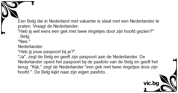 "Ja", zegt de Belg en geeft zijn paspoort aan de Nederlander. De Nederlander opent het paspoort bij de pasfoto van de Belg en geeft het terug. "Kijk," zegt de Nederlander "een gek met twee ringetjes door zijn hoofd.". De Belg kijkt naar zijn eigen pasfoto die met twee ringetjes in zijn paspoort is bevestigd en begint te lachen. Een week later komt de Belg terug van vakantie. Net als hij uit de auto stapt ziet hij zijn buurman. "Buurman, heb jij wel eens een gek met twee ringetjes door zijn hoofd gezien?" Vraagt de Belg. "Nee." Zegt de buurman. "Heb je jouw paspoort bij je?" Vraagt de Belg. "Nee." Zegt de buurman. "Nou, kijk." zegt de Belg en haalt zijn eigen paspoort tevoorschijn en slaat het open bij de pasfoto.